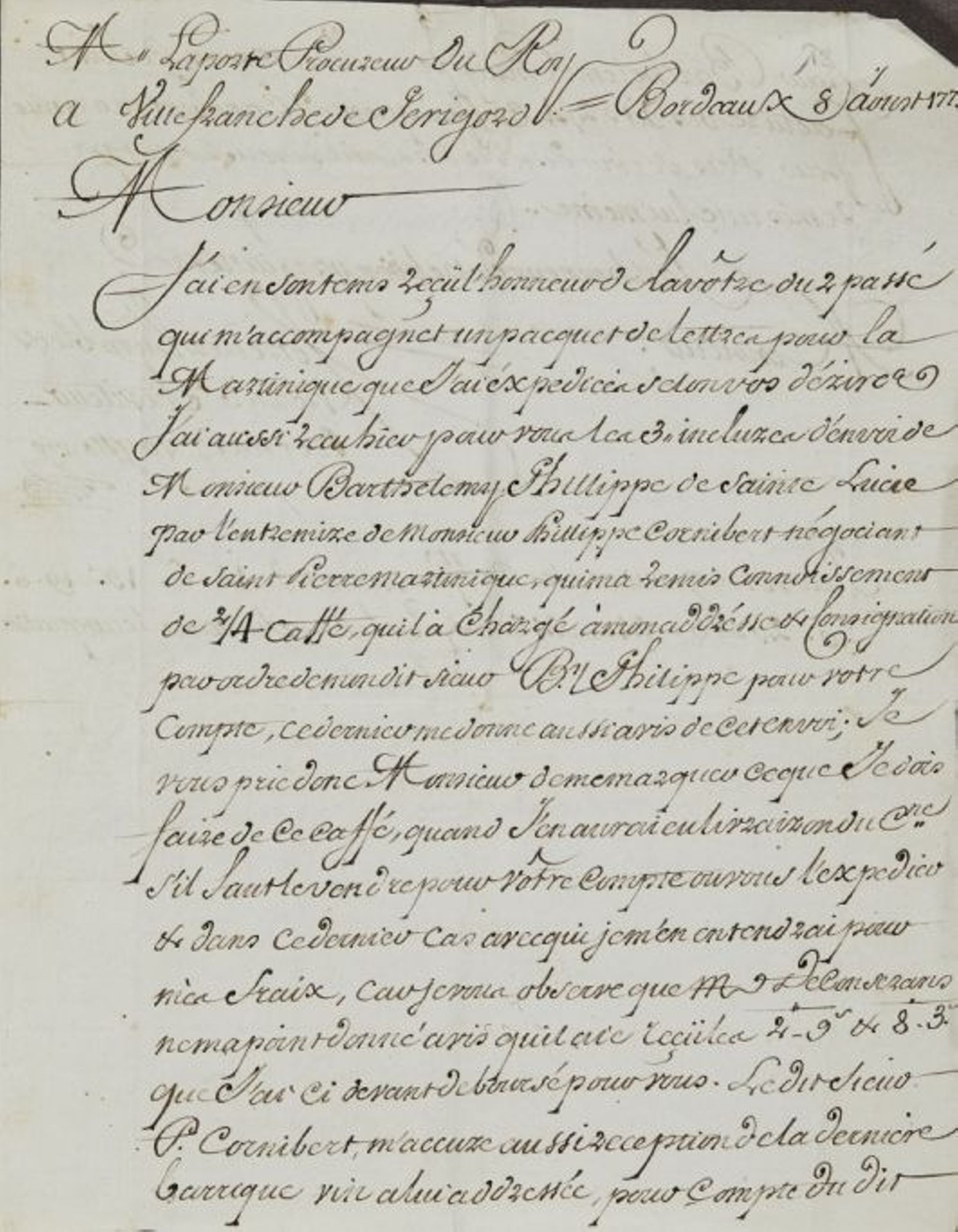 Barthélemy Philippe a fait expédier du café de Sainte-Lucie, par l’intermédiaire d'un négociant de Saint-Pierre de Martinique, à Bordeaux. Le café a été chargé à bord du navire La Pauline. Ce document permet d'évaluer les frais nécessaires au transport.