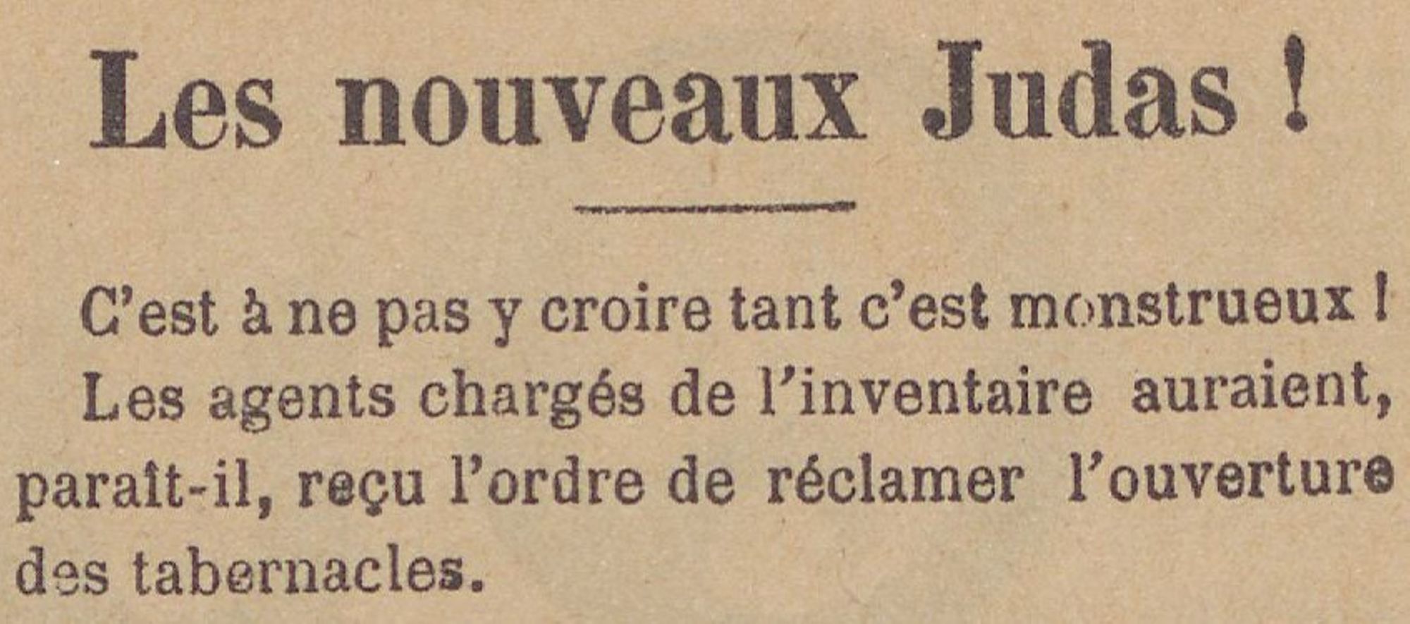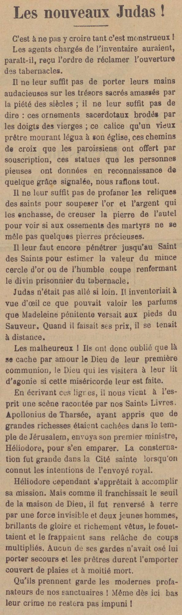 La presse catholique et conservatrice se mobilise et profite de sa large diffusion pour exhorter ses fidèles : « Le Quercinois. Organe de défense nationale et libérale » n’hésite pas à comparer les agents chargés de l’inventaire à de « nouveaux judas » dans ses pages du 13 janvier 1906 (doc. 2).