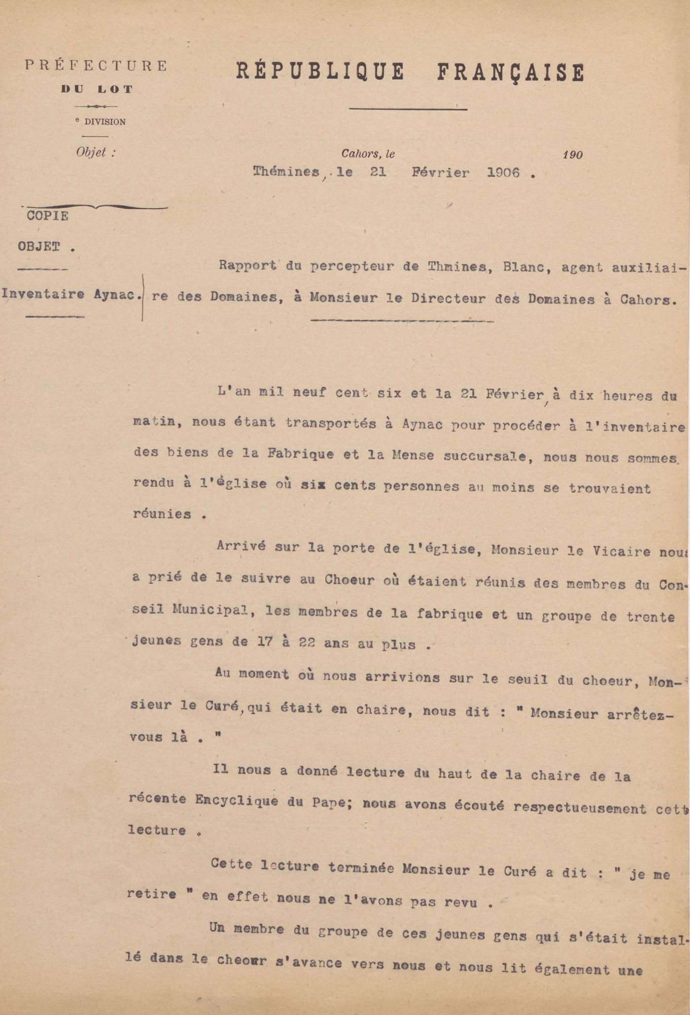 Une fois la révocation prononcée, l’inventaire des biens de la fabrique d’Aynac peut enfin se dérouler, mais sous conditions, comme le prouve le compte-rendu du 8 avril 1906 du sous-inspecteur de l’Enregistrement, des Domaines et du timbre :