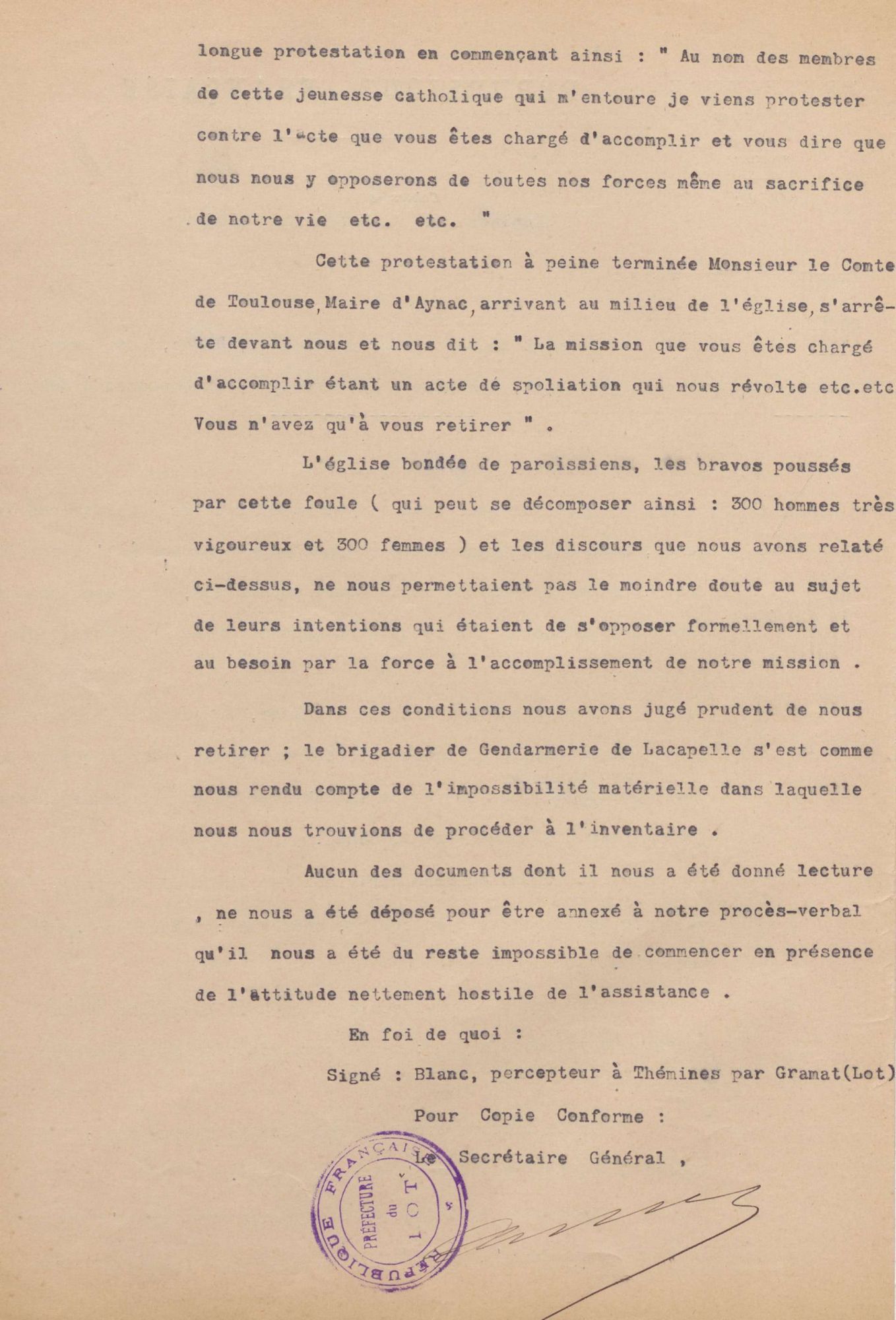 A Aynac, la résistance s’organise autour du maire, le comte Bertrand de Toulouse-Lautrec, cousin du célèbre peintre. Marié à la propriétaire du château d’Aynac, Louise de Turenne, il a été élu maire de la commune en 1904. Connu pour son conservatisme, son attitude véhémente et agressive empêche le percepteur de domaines de procéder à l’inventaire (doc. 3 et 4).