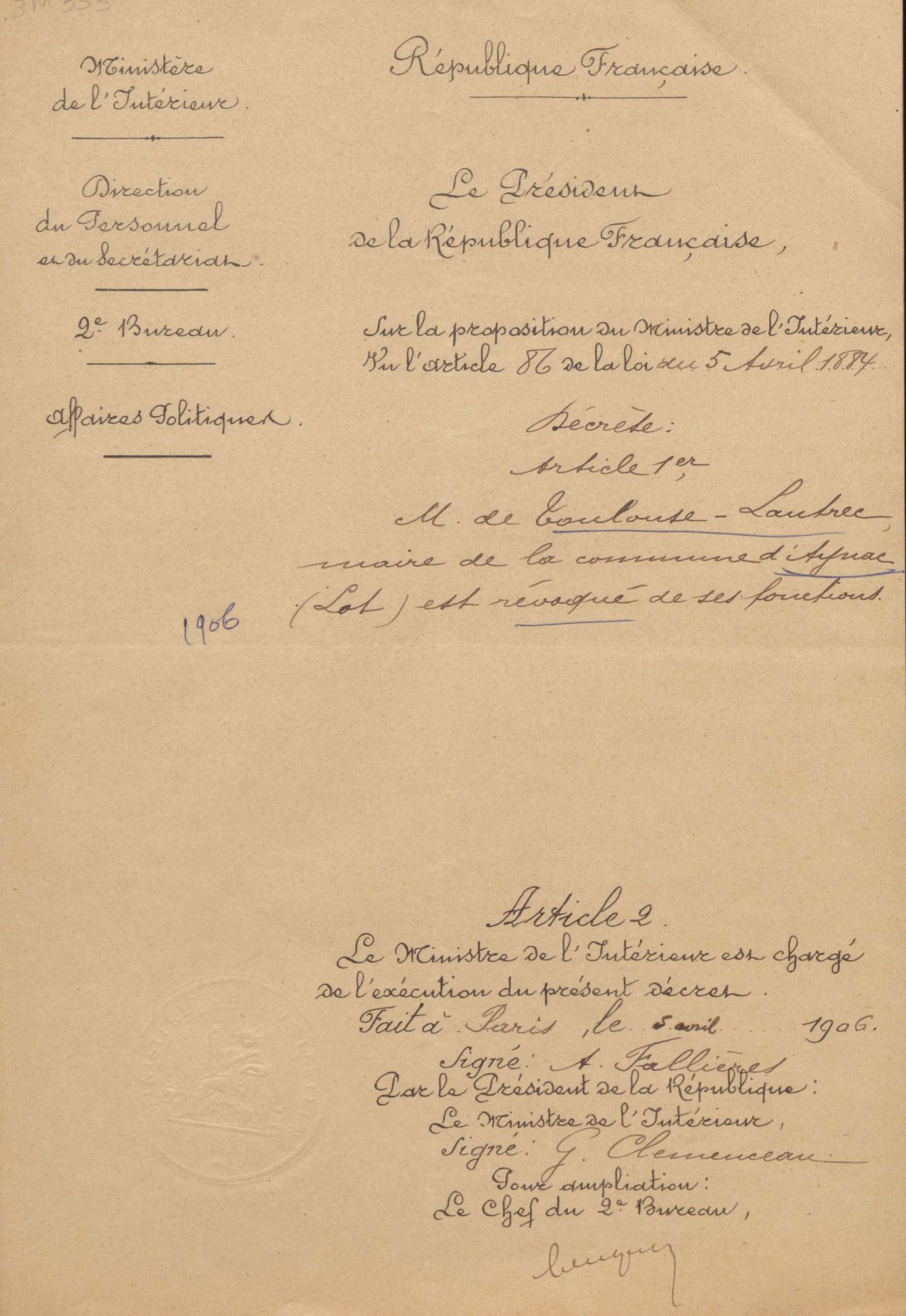 Cet acte de refus obligera le président de la République, A. Fallières, sur proposition du ministre de l’intérieur, G. Clémenceau, à le révoquer de ses fonctions municipales, par décret du 5 avril 1906 (doc. 5).