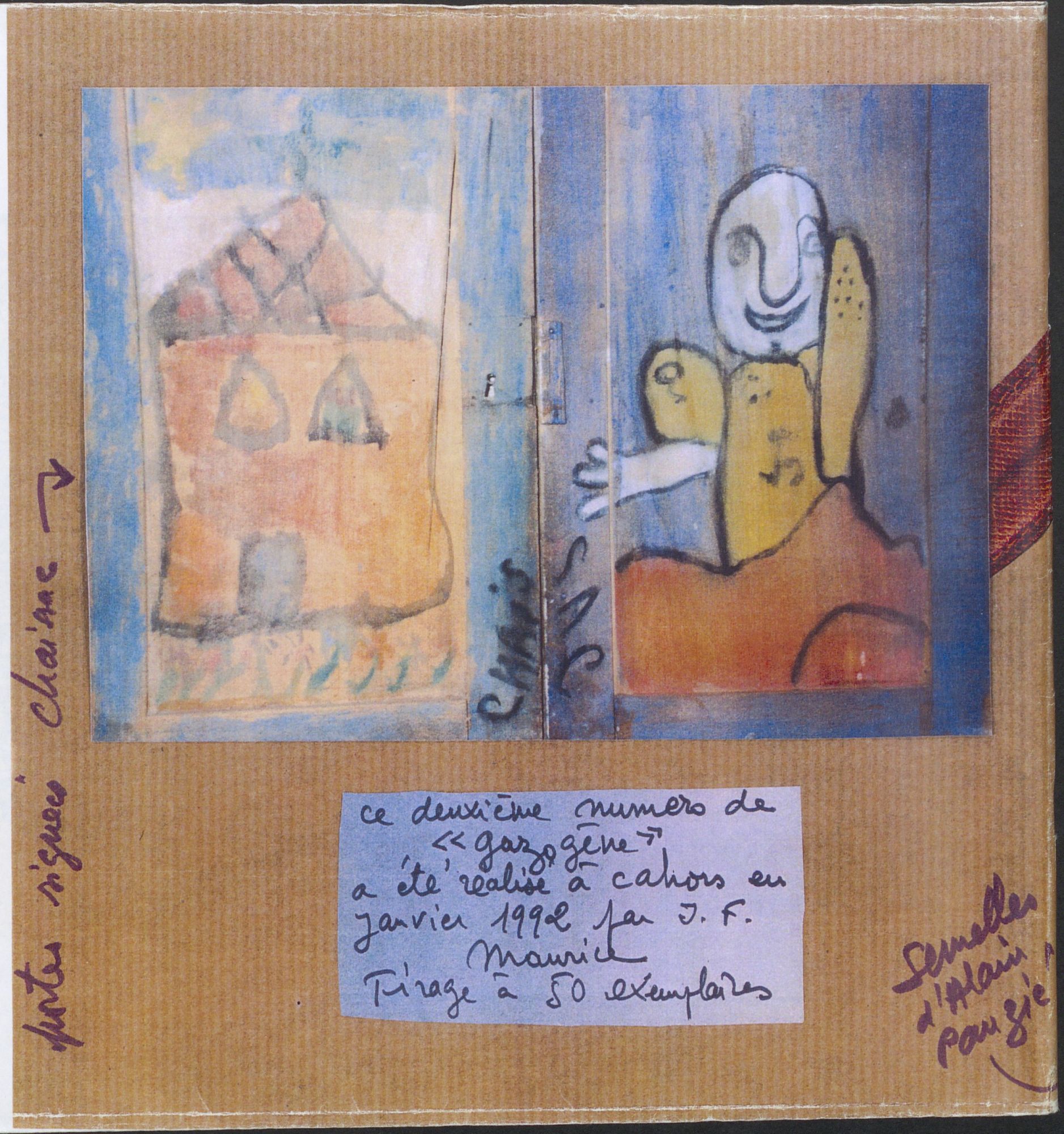 Originaire des Hauts-de-Seine, Jean-François Maurice (1947-2014) découvre le Lot dans les années 1970 et s’y installe définitivement en 1985, d’abord à Cahors, puis à Bélaye vers 2006. Professeur de philosophie, bibliophile et passionné d’art brut dans le sillage de Jean Dubuffet, il devient rapidement l’un des acteurs importants de la vie culturelle du département : « Nos critères viennent de l’Art brut inventé par J. Dubuffet, de la littérature prolétarienne initiée par Henry Poulaille, de l’esprit libertaire enfin » cf. n° 19.