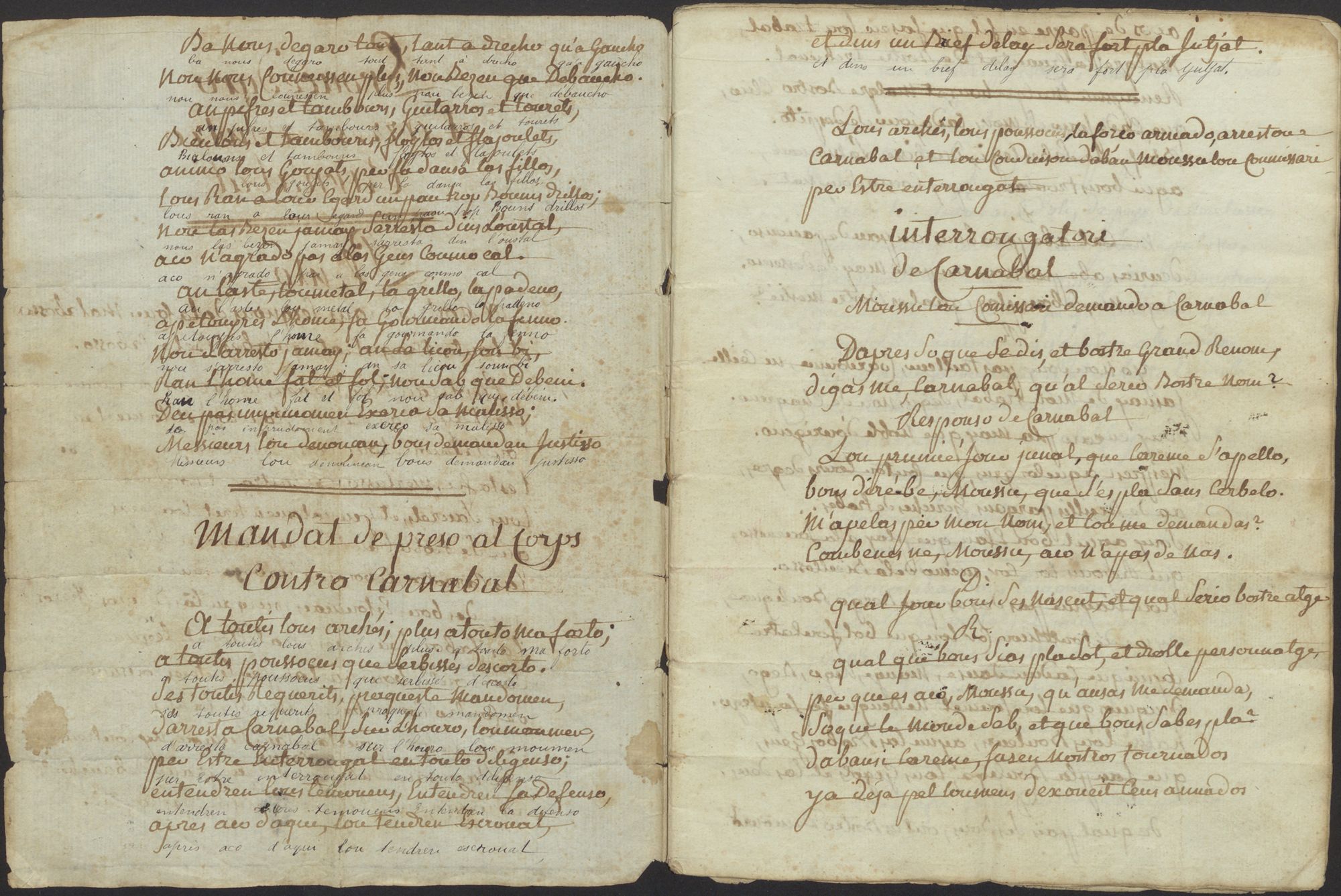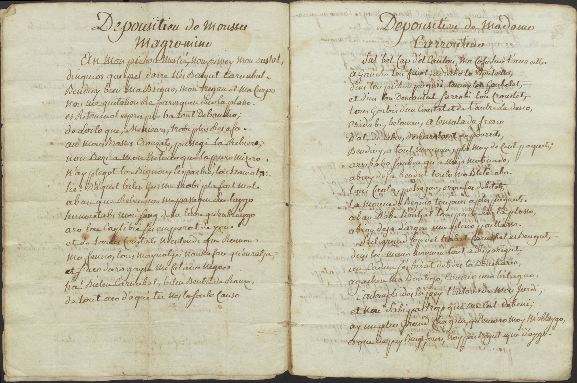 Deux traducteurs se sont succédé, le second ayant peu œuvré (ou s’étant vite essoufflé). Nous proposons parfois une autre lecture (figurant en bleu et entre crochets), car à l’évidence, les traducteurs ne maniaient pas aussi bien la langue d’Oc que l’auteur du jugement. La moitié du texte restait à traduire. Nous avons donc poursuivi le travail, jusqu’au bout.