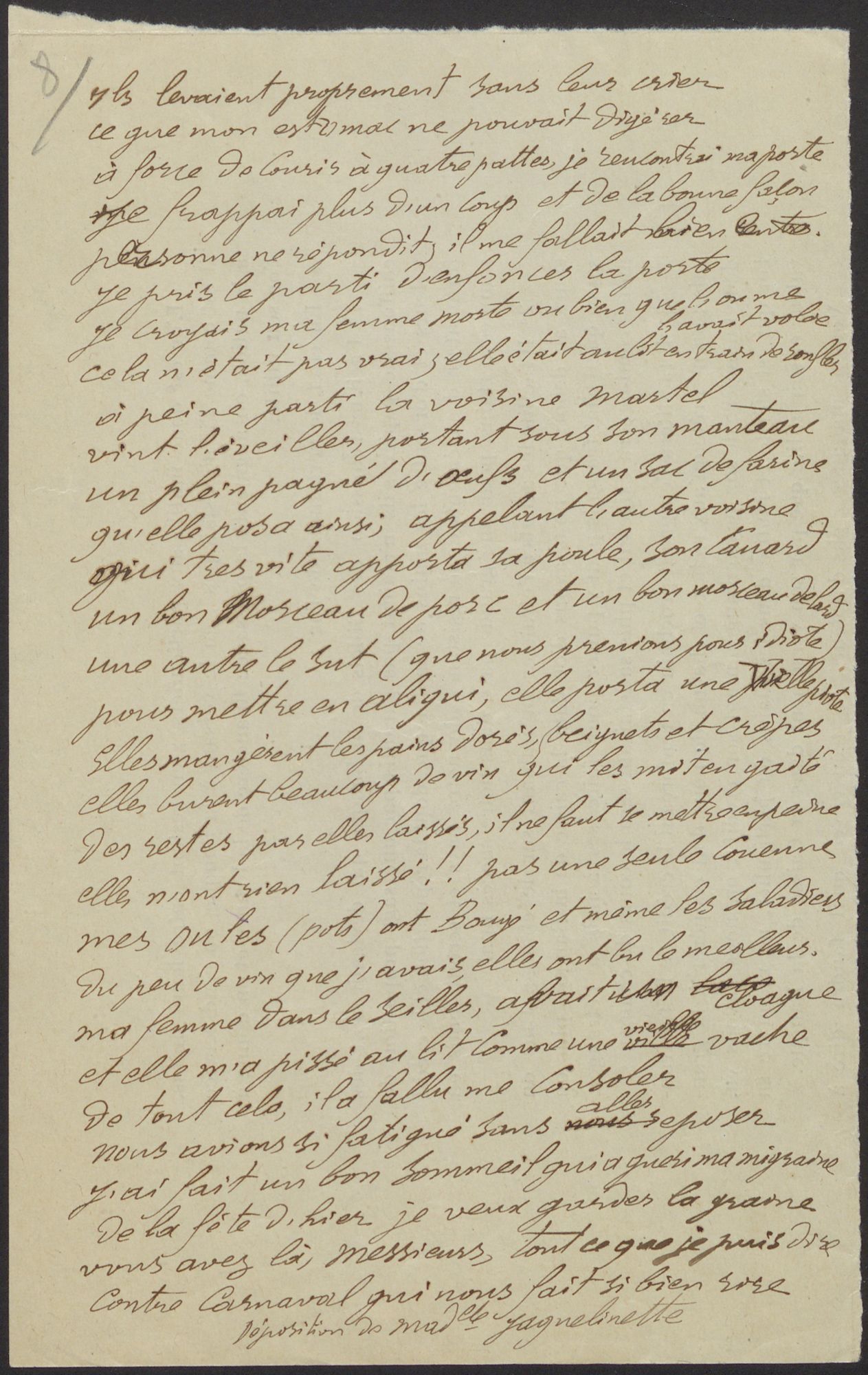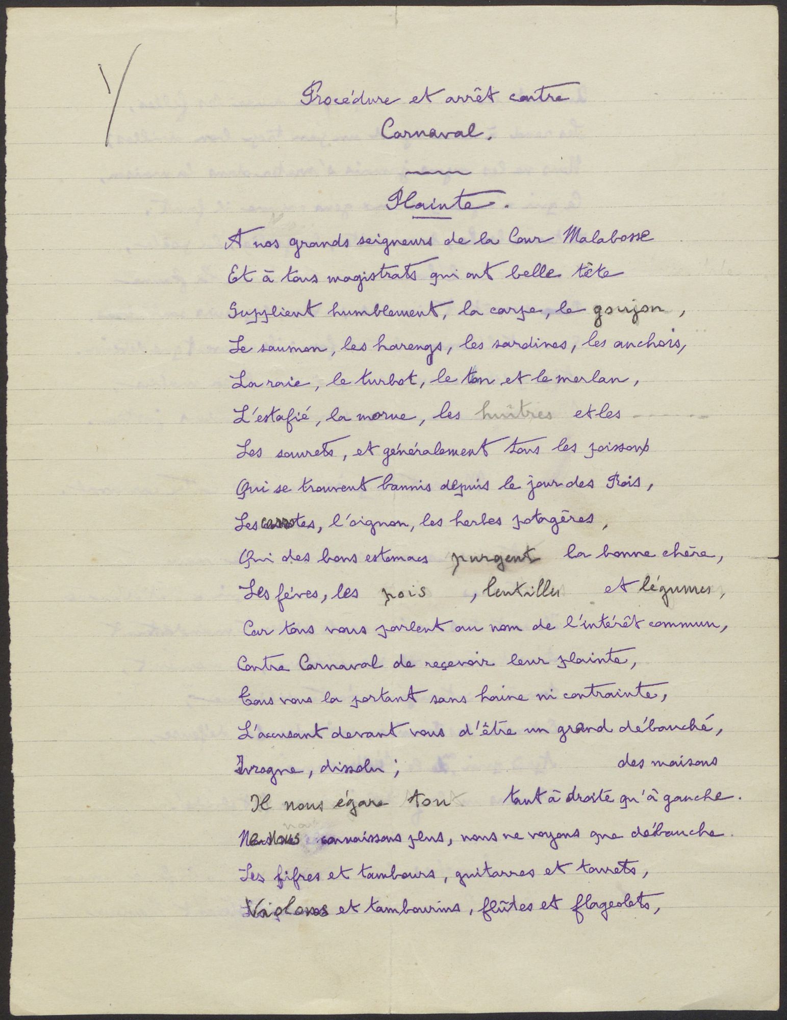 Parmi les papiers de famille isolés, on peut trouver sous la cote 89 J 118, voisinant avec un pamphlet satyrique contre l’Empire, un jugement de carnaval, sans date, couché sur un cahier de réemploi. Rayé, le cahier porte au dos un titre : « Délibération du 2 mars 1775 ». Le texte a donc été rédigé après cette date, soit vraisemblablement dans le dernier tiers du XVIIIe siècle.