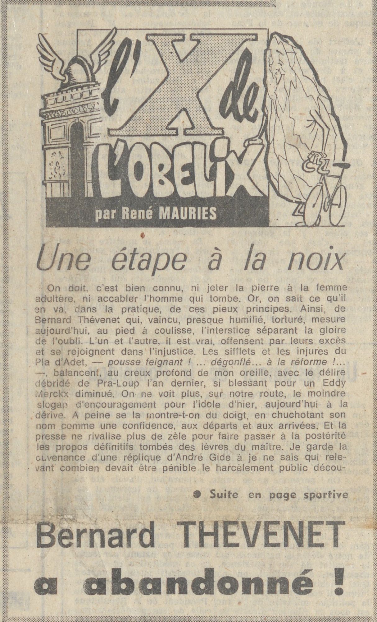 Il s’agit de Bernard Thévenet, vainqueur de l’année précédente, le tombeur du cannibale Eddy Merckx. Malade, Thévenet met le pied à terre à Martel et abandonne la course.