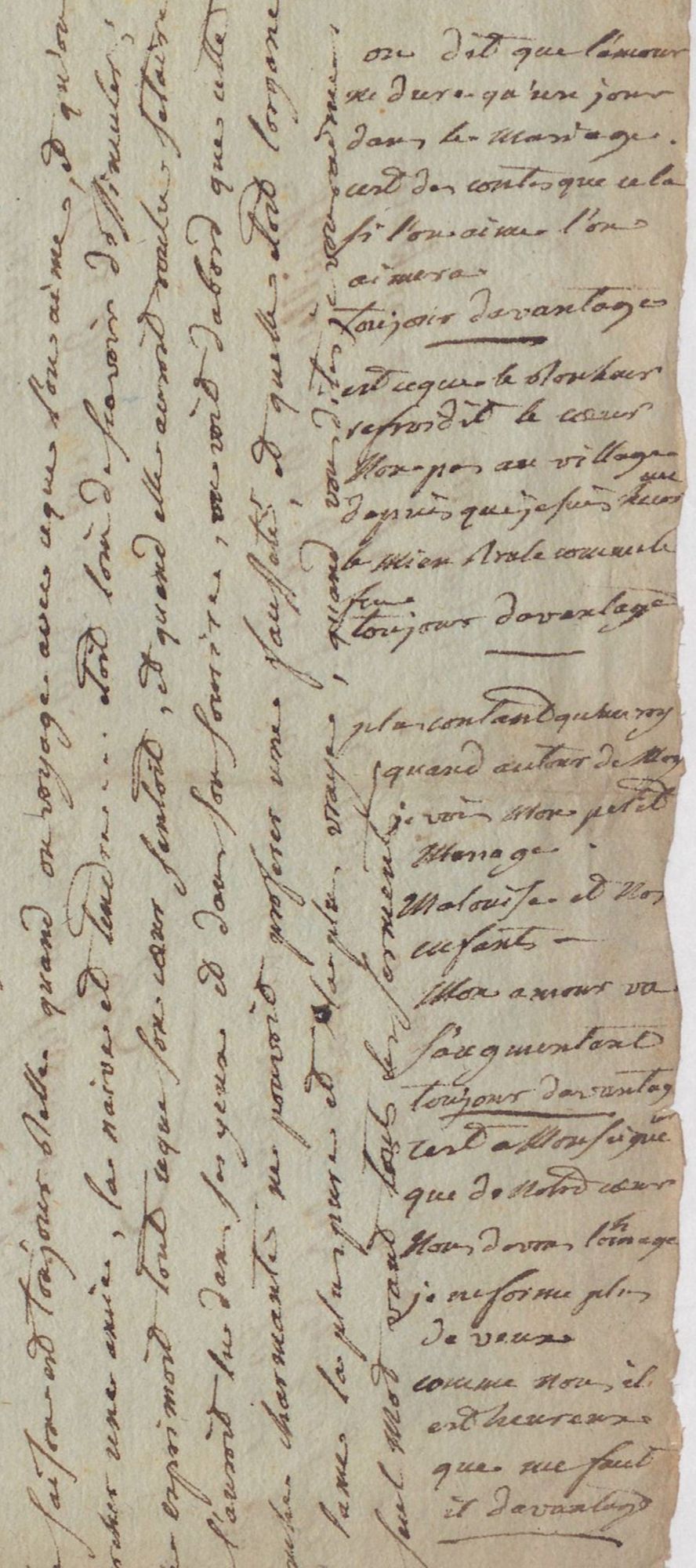 La saison est toujours belle quand on voyage avec ce que l’on aime et qu’on va chercher une amie, la naïve et tendre… étoit loin de savoir dissimuler ; elle exprimoit tout ce que son cœur sentoit, et quand elle auroit voulu se taire, on l’auroit lu dans ses yeux et dans son sourire, on voit d’abord que cette bouche charmante ne pouvoit proférer une fausseté, et qu’elle était l’organe de l’âme la plus pure et la plus vraie, quand vous dites je vous aime, ce seul mot vaut tous les serments.