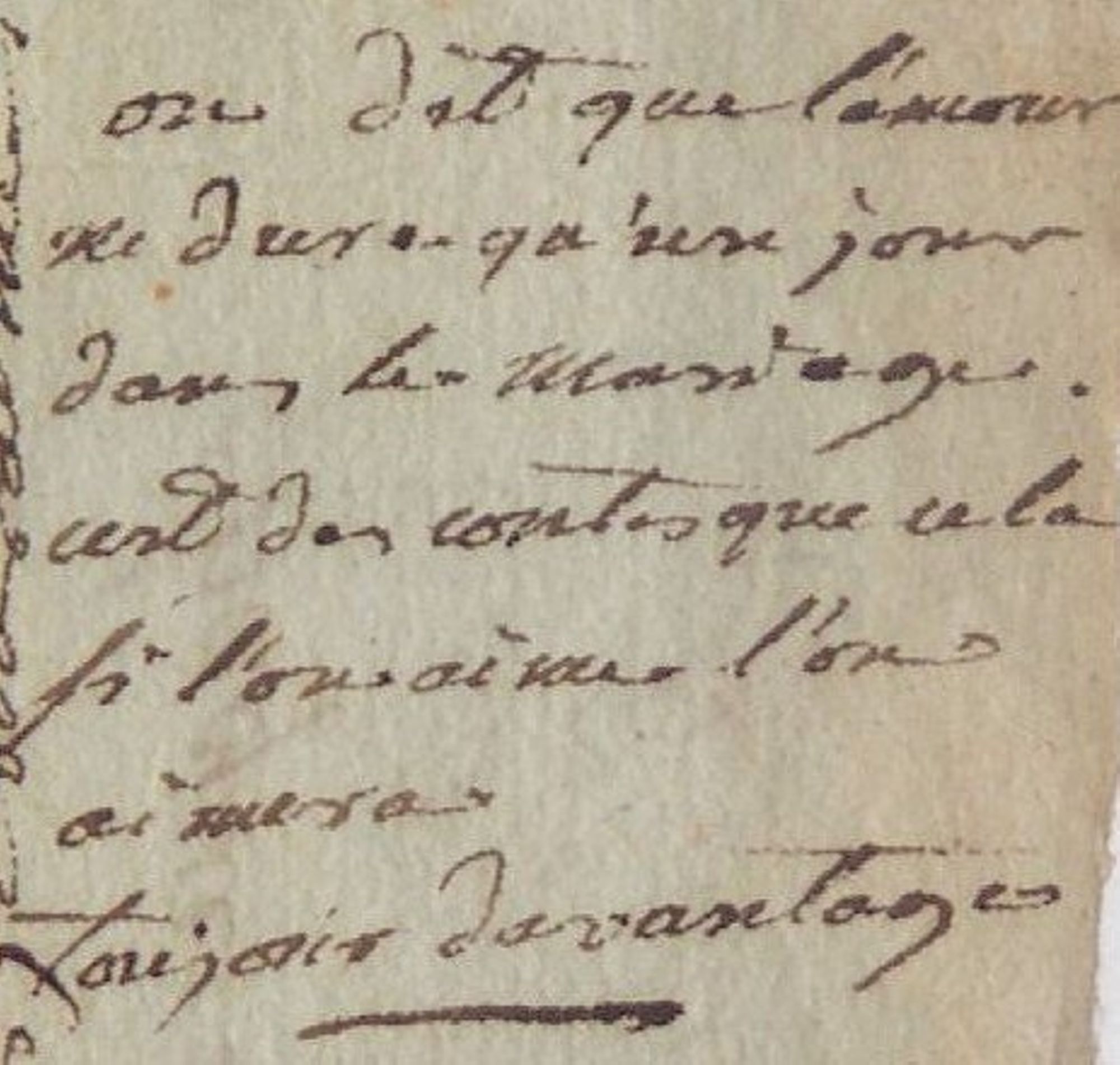 Si j’étois assez malheureux pour que cette lettre fut reçue avec un sentiment de crainte ou d’effroy, je conjure celle à qui elle est adressée de se rassurer, de la lire avec bonté, d’être convaincue que celui qui liroit, perdroit plutôt la vie que de lui causer un seul instant de la peine ; oui, madame vous à que je n’ose donner un nom plus tendre ; oui je suis votre ami, je veux l’etre, et c’est à ce titre que je vais m’entretenir avec vous de l’objet qui m’intéresse le plus au monde, du bonheur de mon amie, il n’est rien que je ne suis prêt à faire pour l’assurer ; daignez me prescrire des ordres, des sacrifices ; tout me deviendra facile, si je puis parvenir à vous rendre heureuse.
