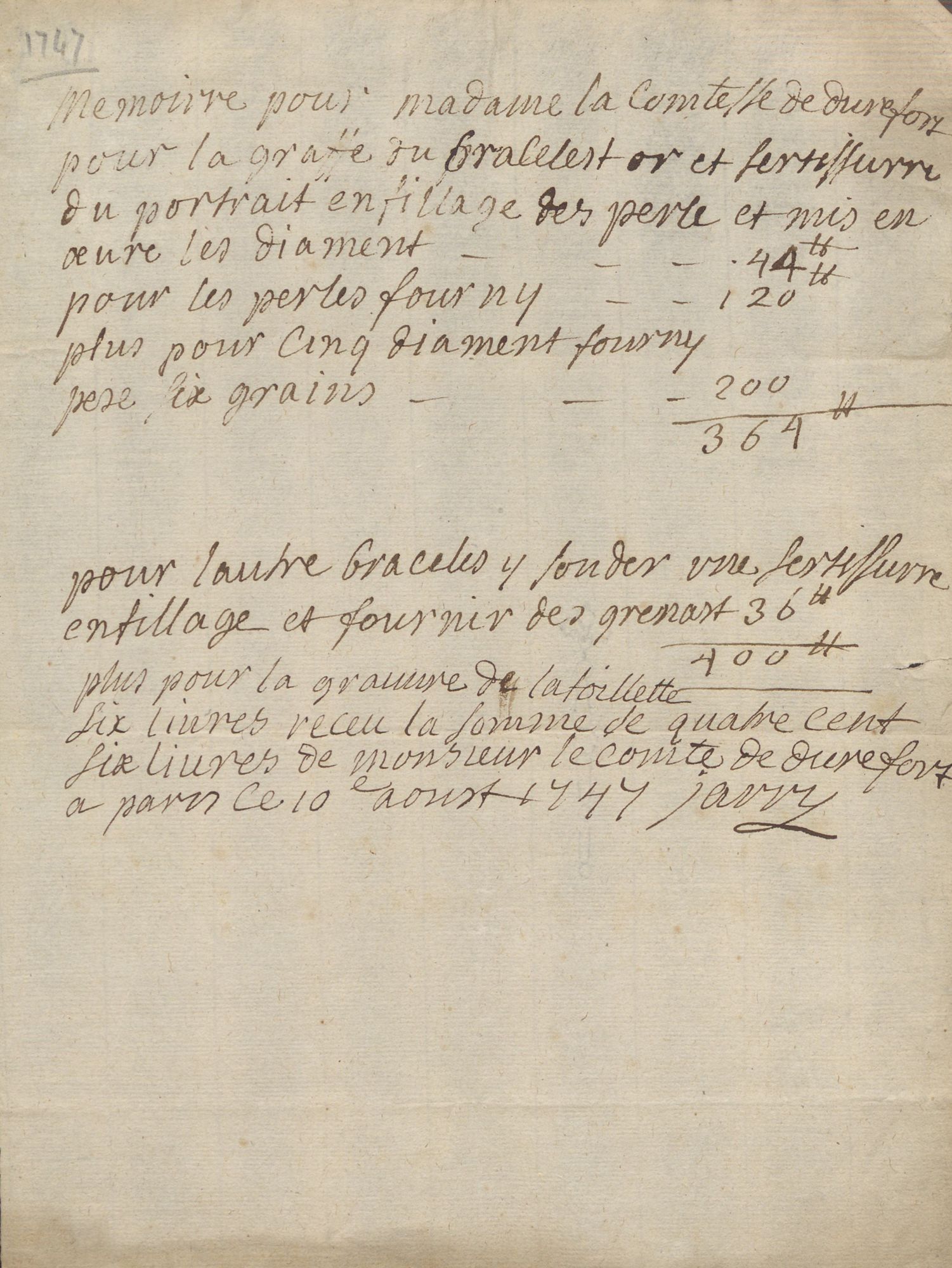 Receu la somme de quatre cent six livres de monsieur le comte de Durefort à Paris ce 10 aoust 1747, Signé Jarry