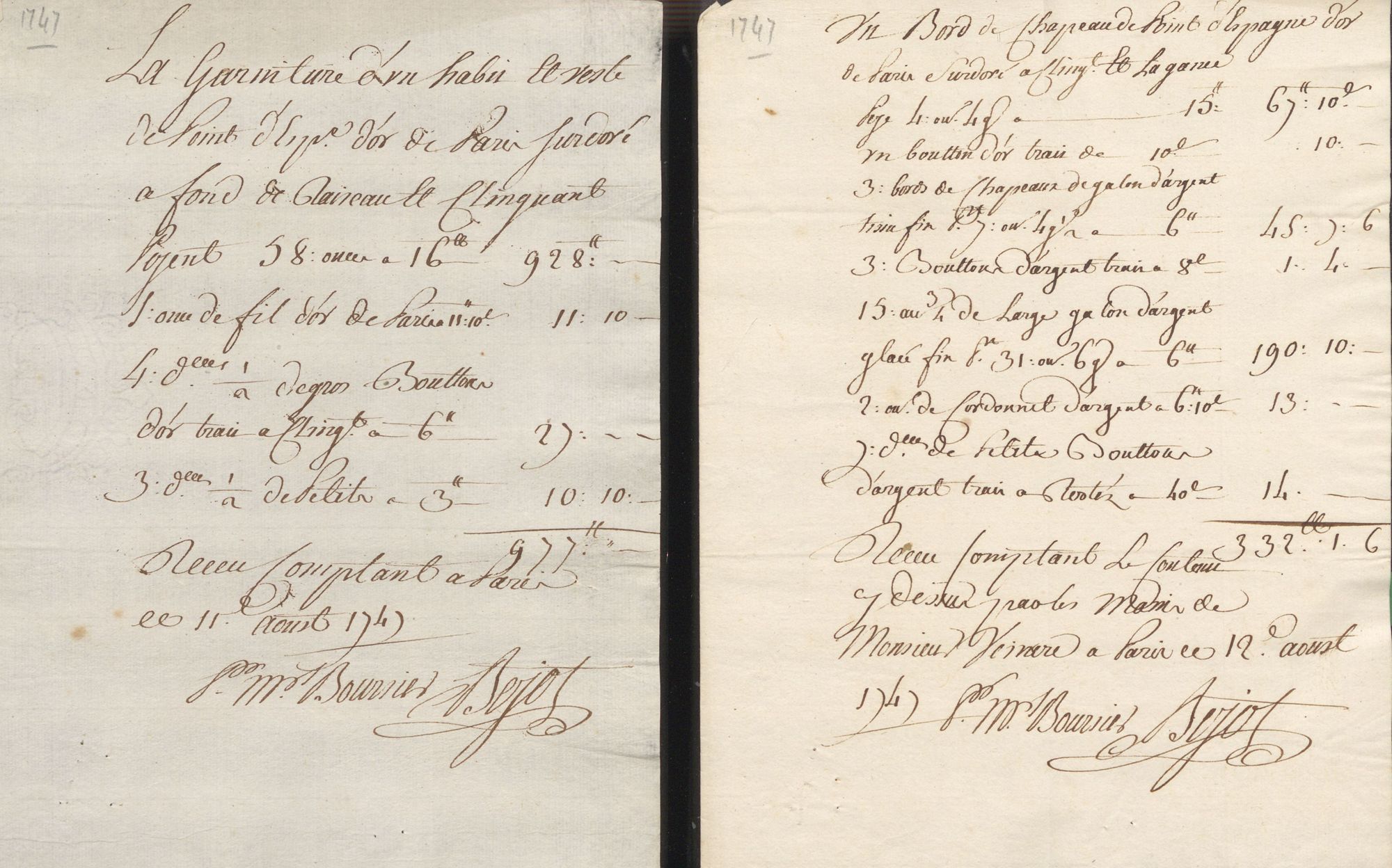 Payé à M. Bourrier marchand de galon d’or pour le montant du mémoire quittancé le 11 aoust 1747 cy joint : 977 livres