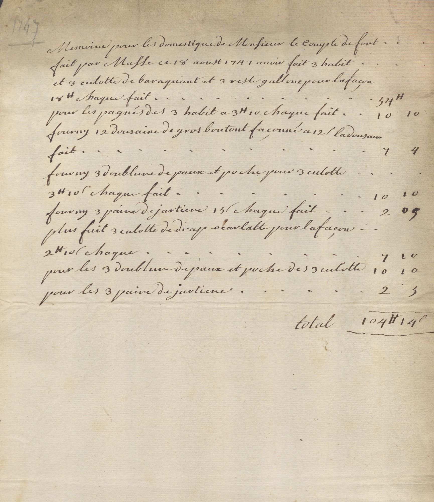 Payé au tailleur qui a habillé les gens suivant l’ordre de monsieur 104 livres 14 sols [cy joint]