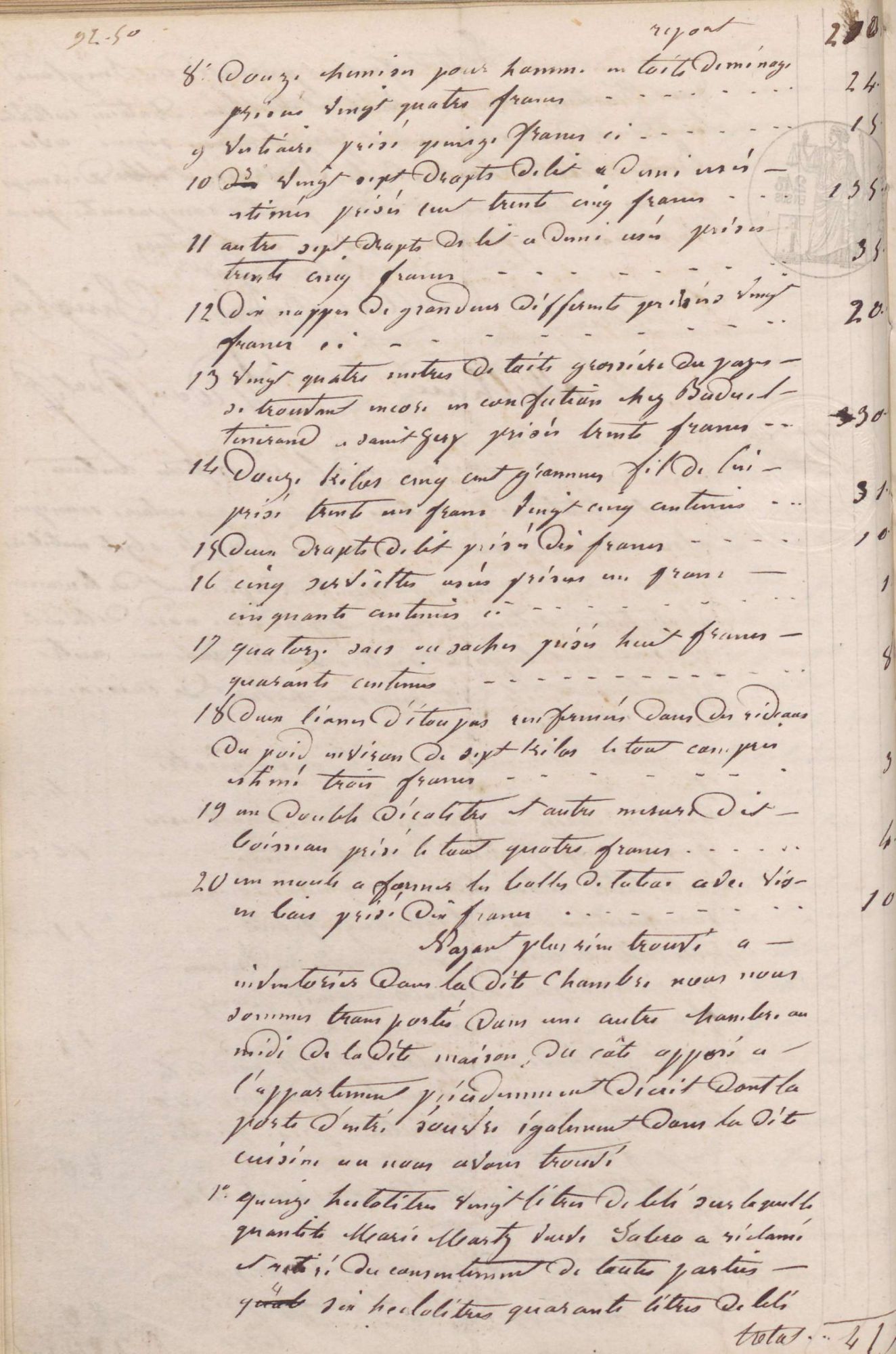 à elle du suivant inventaire du 11 septembre 1829, par suite la quantité de blé comprise au présent inventaire : 9 hectolitres estimés 180 F