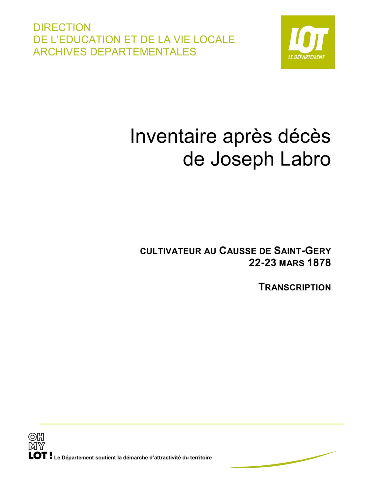 Maitre Redon (notaire à la résidence de Saint-Géry) fait procéder à l’inventaire fidèle (3 E 715/15) et description exacte de tous les meubles meublants, linge, hardes, meubles objets mobiliers de toute nature, meubles réputés immeubles par destination, papiers, titres, argent comptant dépendant de la succession dudit Joseph Labro (né le 22 mai 1818 - décédé le 27 février 1878).