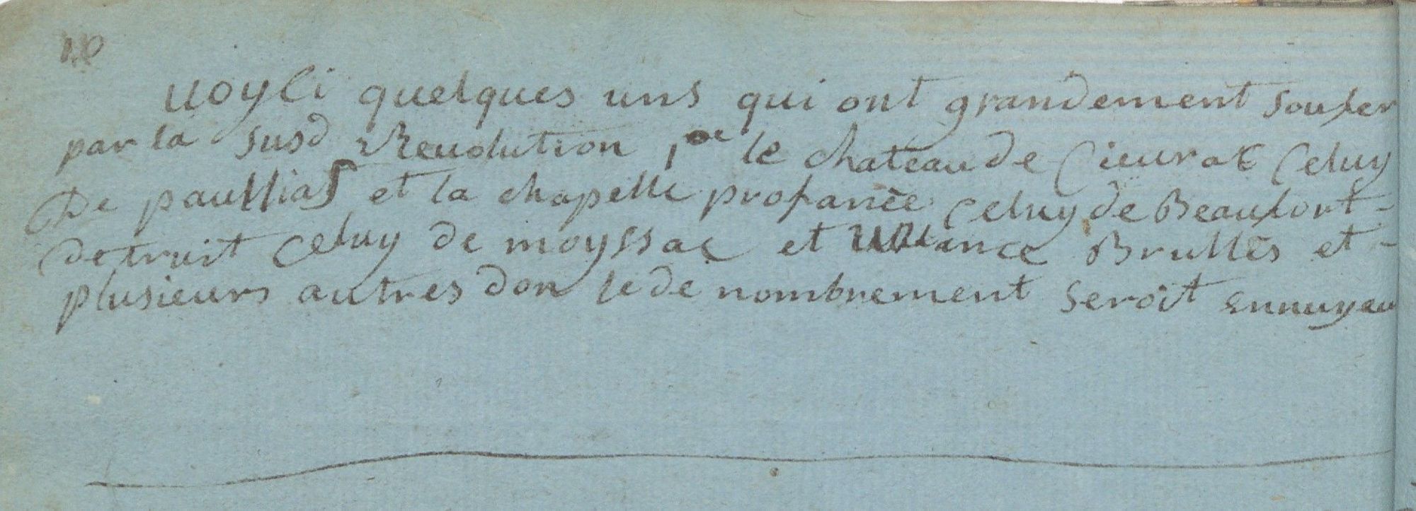 Lorsque cella eut passé chés nous et courant du cotté du midy, le bruit et le désordre devient plus grand car on a pillé les meubles et effaits qu’ils on trouvé dants les châteaux. On a brullé les meubles de bois, les archives ; on a détruit les cabinets, les touts ; apprès avoir boüeu le vin avec eccès, ils ont répandu l’autre par terre, jusques à profaner les chapelles et les vases sacrés, et se son partagés les abis sacerdotaux. On a de plus encore détruit plusieurs châteaux. Voyci quelques uns qui ont grandement soufer par la susdite révolution. 1er le château de Cieurac, celuy de Paullias et la chapelle profanée, celuy de Beaufort détruit, celuy de Moyssac et Valance brullés et plusieurs autres don le dénombrement seroit ennuyeus*.