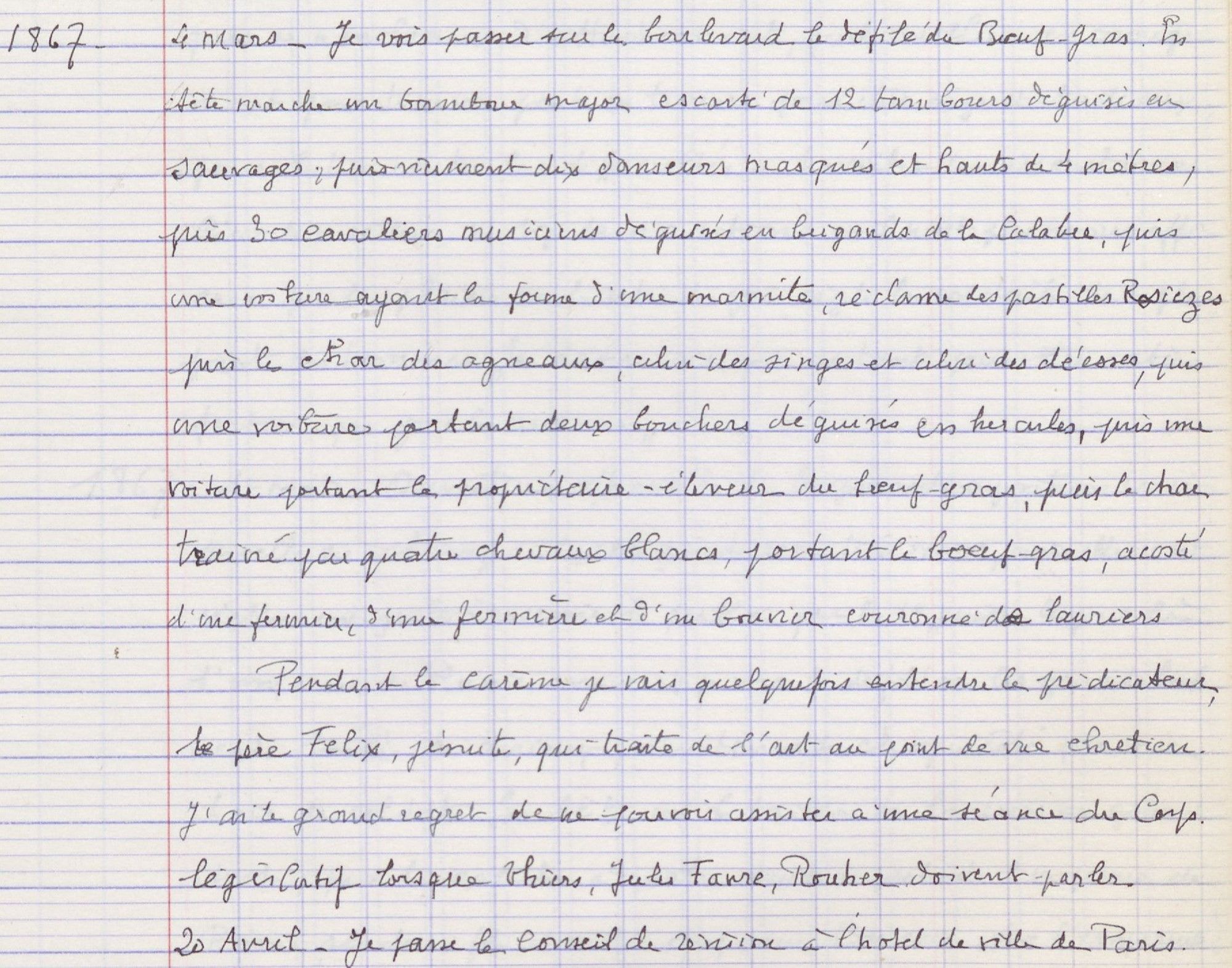 « 4 mars. Je vois passer sur le boulevard le défilé du Bœuf gras. En tête marche un tambour major escorté de douze tambours déguisés en sauvages, puis viennent dix danseurs masqués et hauts de quatre mètres, puis trente cavaliers musiciens déguisés en brigands de Calabre, puis une voiture ayant la forme d’une marmite, réclame des pastilles Rosièzes, puis le char des agneaux, celui des singes et celui des déesses, puis une voiture portant deux bouchers déguisés en hercules, puis une voiture portant le propriétaire-éleveur du bœuf gras, puis le char traîné par quatre chevaux blancs, portant le bœuf gras, acosté d’un fermier, d’une fermière et d’un bouvier couronné de lauriers. »