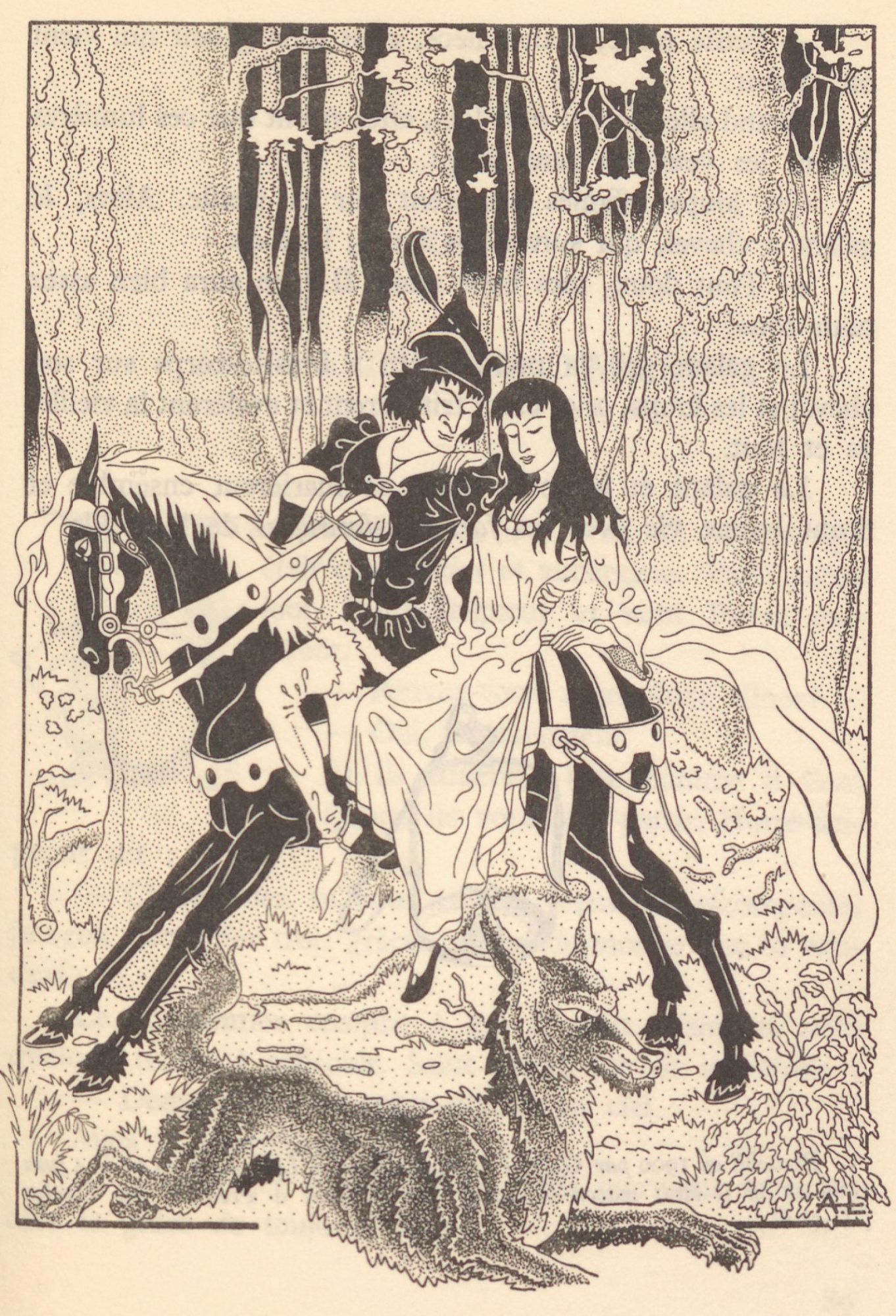 Le galant prit la petite nièce à bras le corps sur son cheval, et les loups, cric, crac, triturèrent et avalèrent la vieille, os et tout.