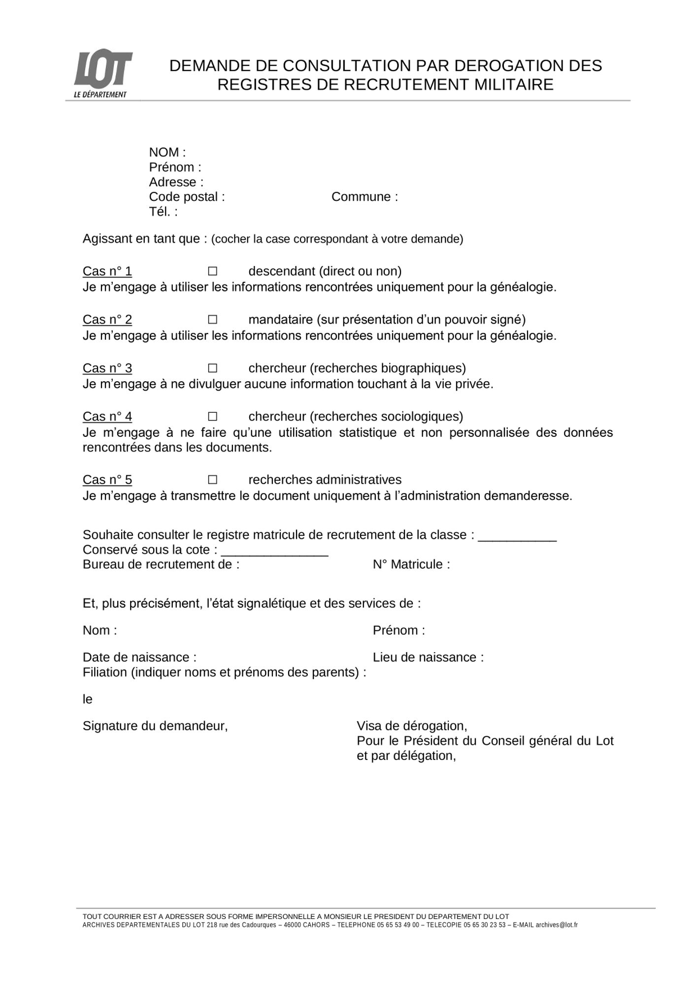 Les Archives du Lot conservent la collection complète des registres matricules du bureau de recrutement de Cahors des classes 1872 à 1940 incluses (individus nés entre 1852 et 1920).