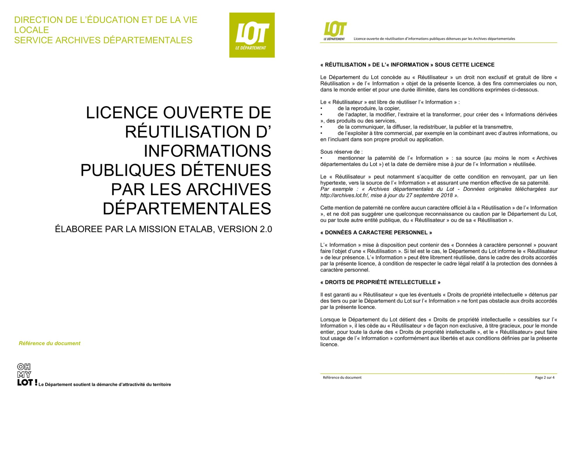 Le Conseil départemental du Lot a en effet adopté, par délibération du 2 octobre 2023, la licence ouverte Etalab 2.0 qui permet une réutilisation libre et gratuite, quel qu'en soit l'objet (commercial ou non), des informations publiques détenues par les Archives départementales.