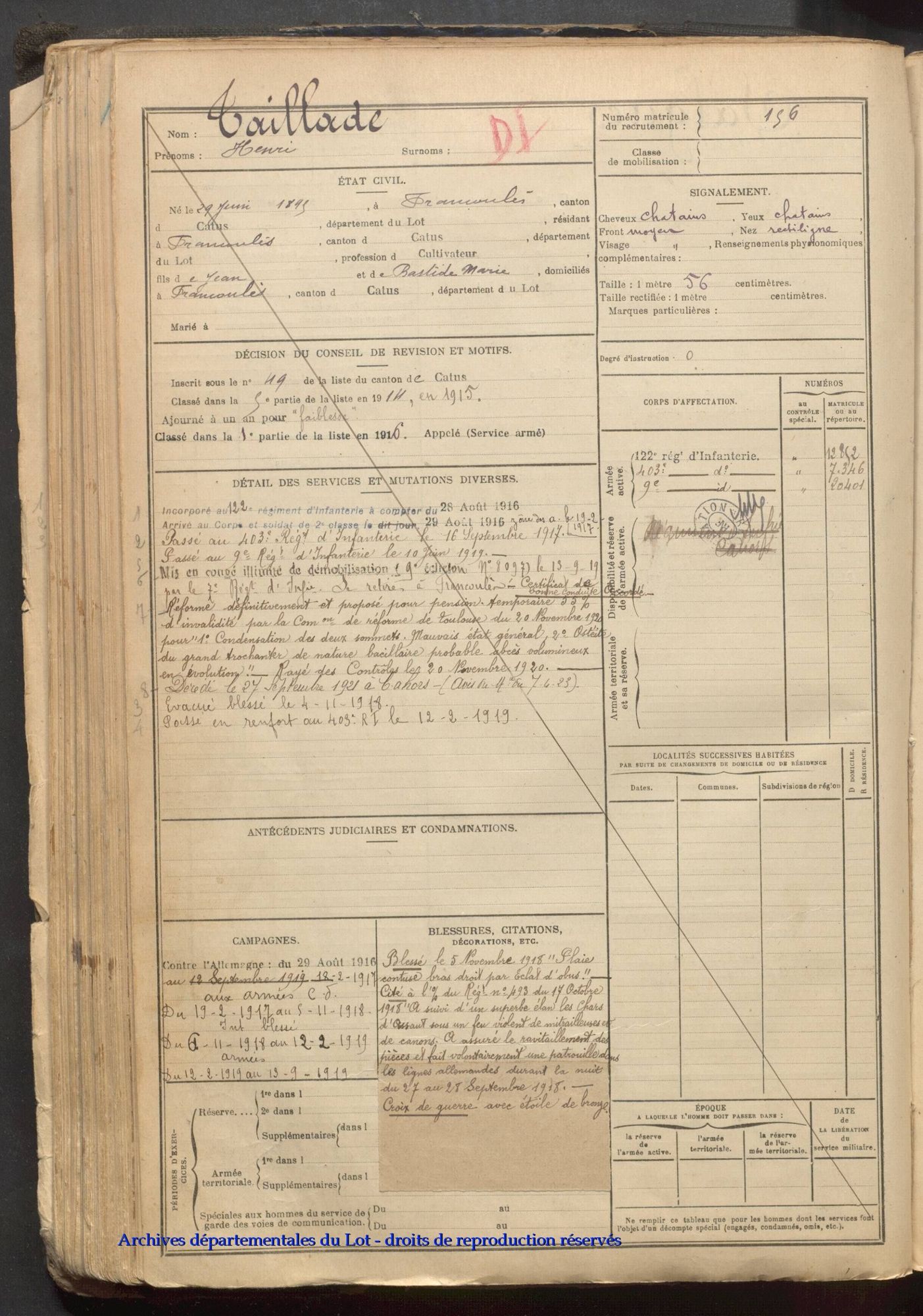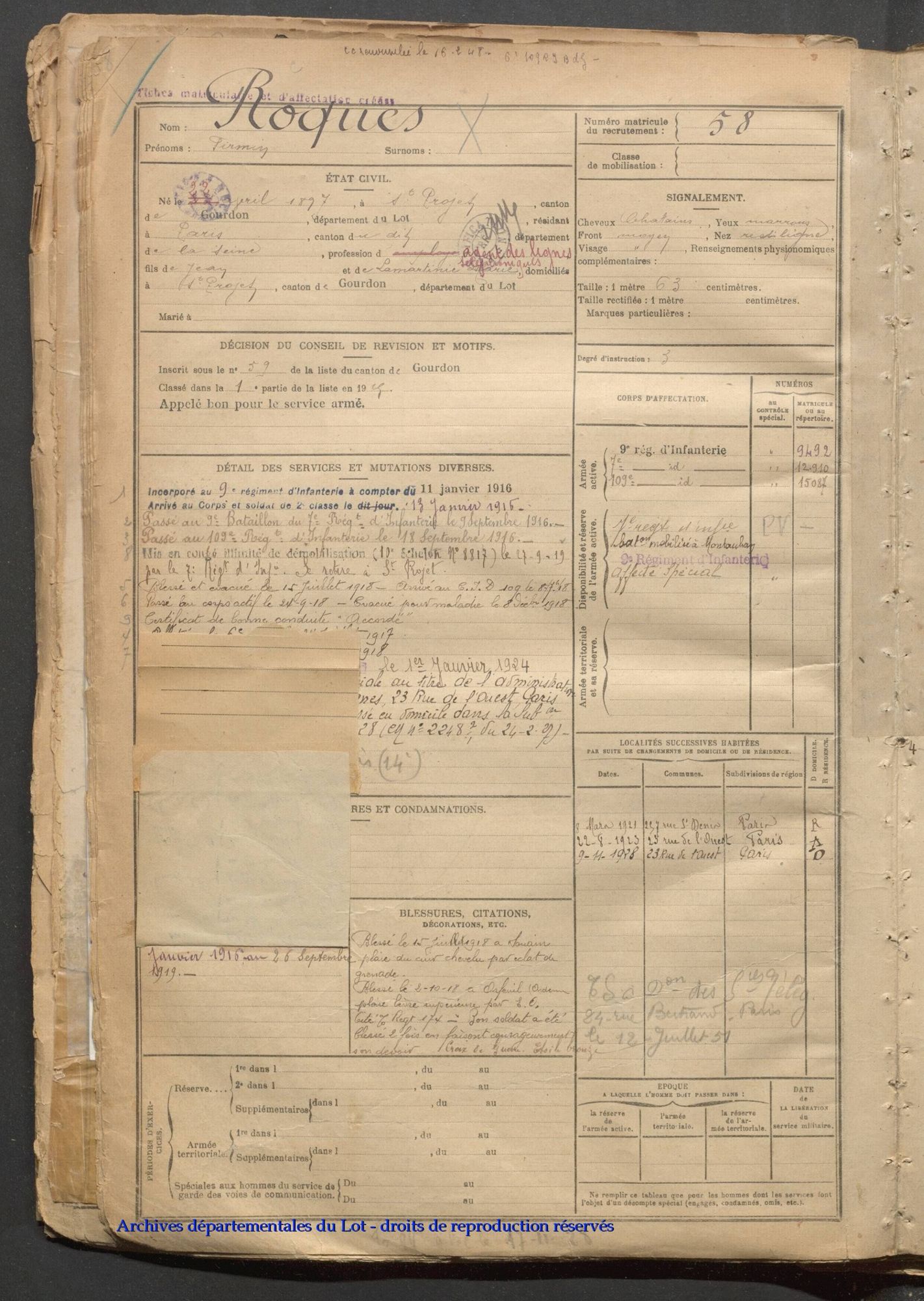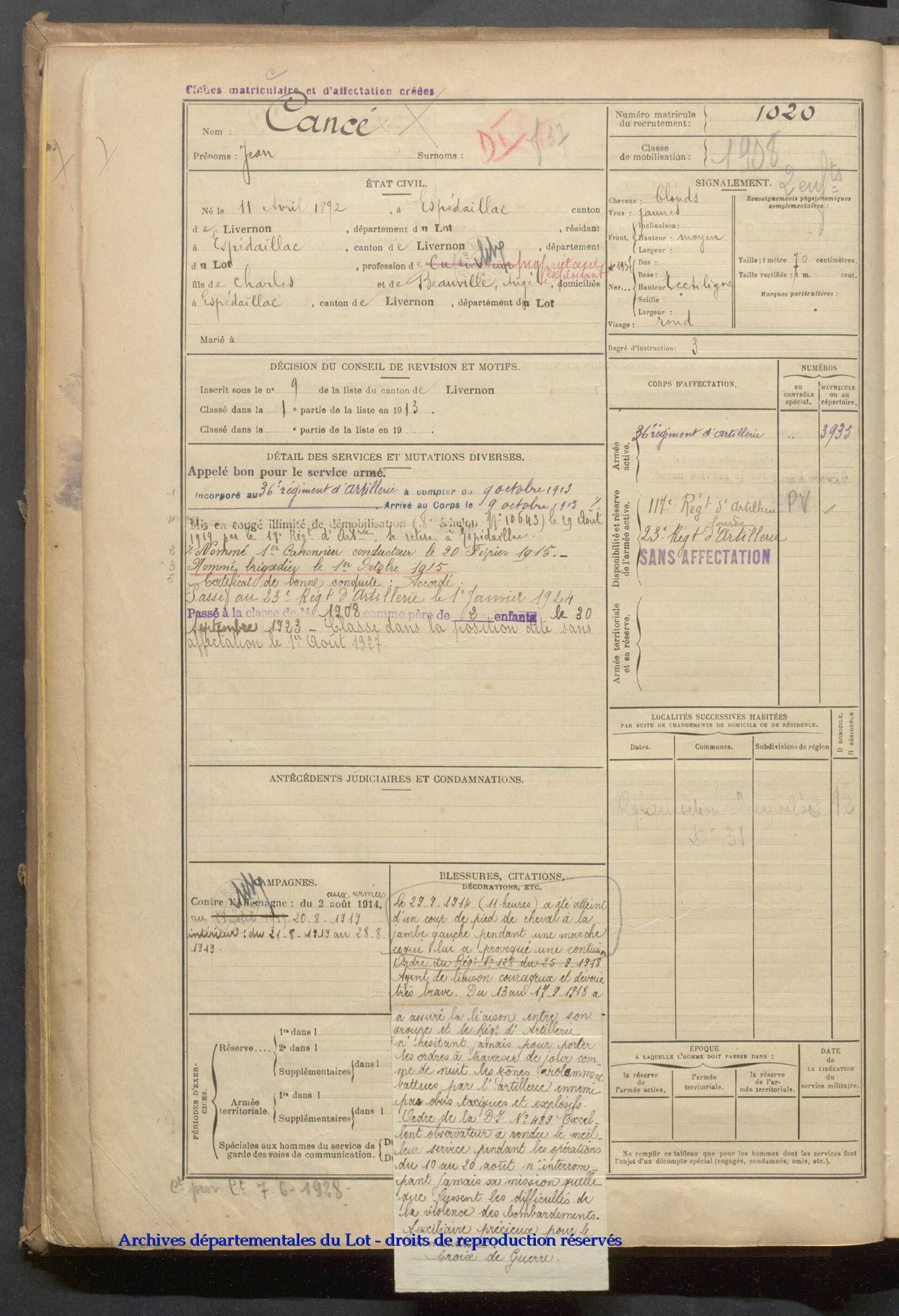 accès à l'ensemble des registres matricules militaires du Lot des classes 1887 à 1921 mais aussi à une base nominative des soldats lotois de la Première Guerre mondiale permettant également une recherche géographique par commune de naissance et/ou de résidence des soldats. Une base nationale du même type, le Grand Mémorial, peut ainsi permettre à la plupart des élèves d'accéder aux fiches matricules militaires de leurs ancêtres ;